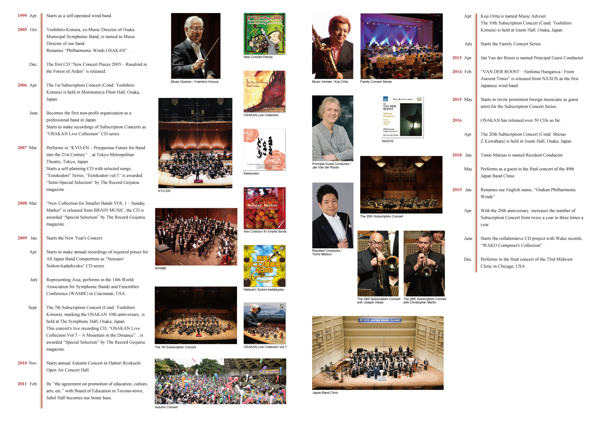 The Osakan Philharmonic Winds was formed in 1999, and became the first non-profit band in 2006, with its home base in JUBEL Hall, Osaka. The ensemble features Yoshihiro Kimura as Honorary Music Director, Tomo Matsuo as Resident Conductor, Jan Van der Roost as Principal Guest Conductor, and Koji Orita as Music Advisor. The OSAKAN annually gives approximately 40 recitals and concerts of varied instrumentation, from full band to chamber ensembles. They often perform in the beautiful IZUMI Concert Hall, welcoming eminent professional musicians such as Joseph Alessi (New York Philharmonic Principal Trombone), Ricardo Morales (Philadelphia Orchestra Principal Clarinet), David Griffin (Chicago Symphony Orchestra Horn), Corrado Giuffredi (Orchesta della Svizzera Italiana Principal Clarinet), and Christopher Martin (New York Philharmonic Principal Trumpet).