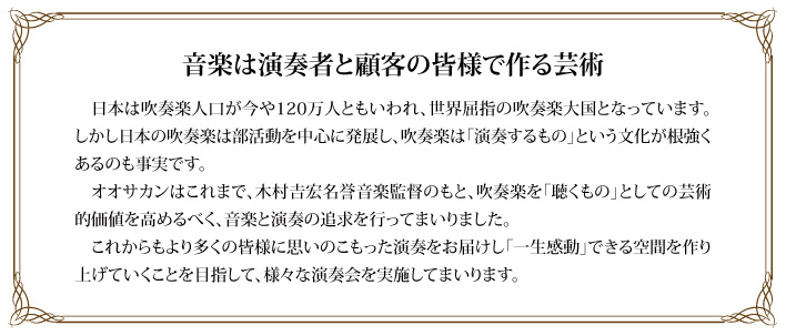 「オオサカンの演奏を若い人にもっと聴いてほしい」という声にお応えした会員制度です。法人あるいは個人の方からの寄付によって、学校吹奏楽部で頑張っている学生さんをオオサカンの定期演奏会にご招待いたします。